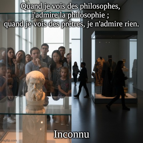 Initialement connu en français sous le titre : « Quand je vois des philosophes, j’admire la philosophie ; quand je vois des prêtres, je n’admire rien. » Le style et le thème renvoient à une tradition aphoristique anticlérienne moderne (XVIIIe-XIXe siècles), et non à l’Antiquité. Auteur✍️ : Aucune source primaire fiable n’est connue pour relier sans ambiguïté ceci à un seul auteur. Souvent attribué à tort à : Voltaire, Nicolas Chamfort, Stendhal. Ces attributions sont largement citées, mais il n’y a aucune source vérifiable dans leurs travaux.