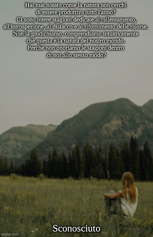 Hai mai notato come la natura non cerchi di essere produttiva tutto l’anno? Ci sono intere stagioni dedicate al rallentamento, all’introspezione, al distacco e al rifornimento delle risorse. Non la giudichiamo, comprendiamo intuitivamente che questa è la natura del nostro mondo. Perché non onoriamo le stagioni dentro di noi allo stesso modo?