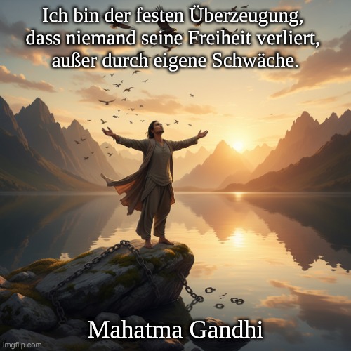 Bedeutung: Persönliche Verantwortung: Gandhi betonte oft die Rolle des Einzelnen in seinem eigenen Leben und die Notwendigkeit, Verantwortung für sein Handeln zu übernehmen. Freiheit und innere Stärke: Das Zitat passt zu seiner allgemeinen Philosophie der Gewaltlosigkeit und Selbstdisziplin, wonach er glaubte, dass wahre Freiheit aus innerer Stärke entsteht. Ursprung: Historischer Kontext: Gandhi war eine führende Persönlichkeit der indischen Unabhängigkeitsbewegung, und seine Vorstellungen von Freiheit und Verantwortung wurden durch seine Erfahrungen mit Kolonialismus und Unterdrückung geprägt. Philosophische Einflüsse: Seine Gedanken wurden auch von verschiedenen Philosophien beeinflusst, darunter die der Bhagavad Gita, Tolstois und Thoreaus. Wirkung: Inspiration für andere: Gandhis Aussagen und Philosophien haben weltweit Einfluss gehabt und inspirieren Menschen weiterhin in ihrem Kampf für Freiheit und Gerechtigkeit. Anwendung: Die Botschaft über persönliche Verantwortung und die Kraft des Willens ist in verschiedenen Kontexten relevant, von der persönlichen Entwicklung bis hin zu sozialen und politischen Bewegungen. Fazit: Mahatma Gandhi wird oft als Autor dieses Zitats genannt, und sein Lebenswerk und seine Philosophien über Freiheit, Verantwortung und Gewaltlosigkeit sind für viele Menschen nach wie vor eine wichtige Inspirationsquelle. Dieses Zitat spiegelt seine Überzeugung wider, dass jeder Einzelne die Kraft hat, durch seine Entscheidungen und Handlungen sein eigenes Leben und seine Freiheit zu gestalten.