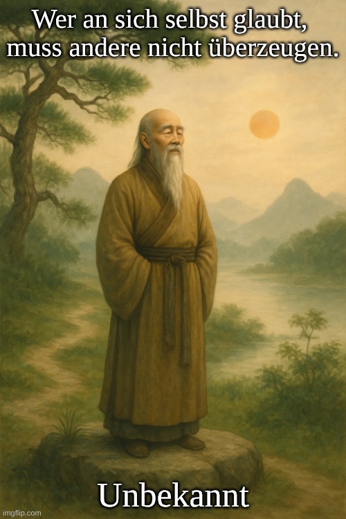 Selbstvertrauen ersetzt das Bedürfnis nach Anerkennung oder den Kampf um Recht. Herkunft: Oft Laozi (auch: Lao-tse oder Lao Tzu) zugeschrieben. Es gibt keine direkte Quelle im Tao Te Ching (道德經), Laozis einzigem überlieferten Werk, in dem dieser Satz wörtlich vorkommt. Der Spruch passt inhaltlich perfekt zu Laozis Gedankenwelt.