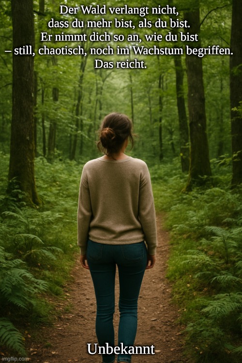 Der Wald verlangt nicht, dass du mehr bist, als du bist. Er nimmt dich so an, wie du bist – still, chaotisch, noch im Wachstum begriffen. Das reicht.