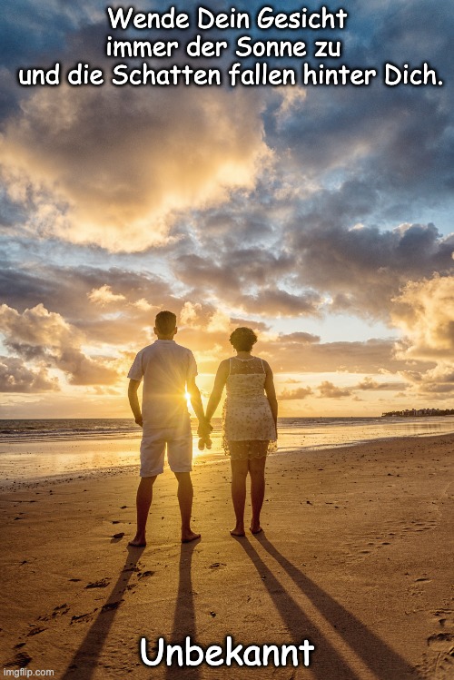 Foto: Diego Pontes. Bedeutung 🌟:Positiver Fokus: Das Sprichwort ermutigt dazu, die Aufmerksamkeit auf die positiven und hoffnungsvollen Aspekte des Lebens zu richten. Probleme hinter sich lassen: Indem man sich auf das „Licht“ (das Positive) konzentriert, verschwinden die „Schatten“ (Probleme, Sorgen oder negative Gedanken) sinnbildlich aus dem Blickfeld und dem Einflussbereich; sie fallen „hinter“ einen. Optimismus: Es ist eine Metapher für eine optimistische Lebenseinstellung. 🌱 Ursprung: Frühe Erwähnungen:Die frühesten Varianten dieses Sprichworts tauchten bereits Mitte des 19. Jahrhunderts auf.1850: Der englische Dichter Charles Swain verwendete eine ähnliche Bildsprache in einem Gedicht. 1862: Die älteste bekannte, anonyme Version erschien in einer Zeitung in West Virginia: „Wende dich der Sonne zu, und dein Schatten fällt hinter dich.“Weitere Versionen:Helen Keller verwendete eine sehr ähnliche Variante in einem Gedichtalbum: „Wende dein Gesicht der Sonne zu, und du kannst den Schatten nicht sehen“, doch das Sprichwort war zu diesem Zeitpunkt bereits länger im Umlauf. ✍️ Autor:Falsche Zuschreibung: Obwohl dieses Sprichwort oft Walt Whitman zugeschrieben wird, ist dies nicht korrekt. Namensverwechslung: Der Zitatforscher kam zu dem Schluss, dass es sich wahrscheinlich um eine Verwechslung handelt. 1903 wurde eine Version des Sprichworts einem gewissen M. B. Whitman zugeschrieben. Um 1910 wurde der Nachname „Whitman“ ohne Initialen verwendet. Erst 1919 wurde die Urheberschaft fälschlicherweise Walt Whitman zugeschrieben. Fazit: Das Sprichwort hat keinen einzelnen Autor. Es entstand und entwickelte sich im Laufe des 19. Jahrhunderts organisch. Walt Whitman wird zwar am häufigsten damit in Verbindung gebracht, dies beruht jedoch auf einem historischen Irrtum. Der wahre Ursprung ist anonym – was das Sprichwort vielleicht umso universeller macht.