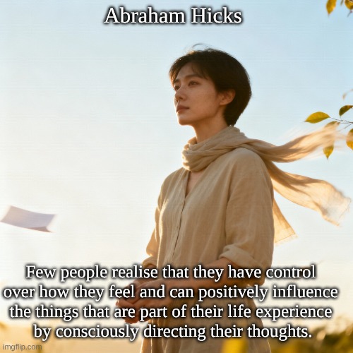 Image: Peter van Geest AI. Meaning: The gist of this statement is that by consciously choosing and directing their thoughts, people can control their feelings and thus positively influence their experiences and reality. This is the core of Abraham Hicks’ teachings: everyone is a co-creator of their own reality and can positively alter it by directing their attention and intention. Origin: The source of this idea lies with Abraham Hicks (Esther Hicks as a channel), a well-known teacher of the Law of Attraction. Numerous quotes from them are very close in wording and content, but the exact quote doesn’t seem to appear verbatim as an official quote in their books or workshops.