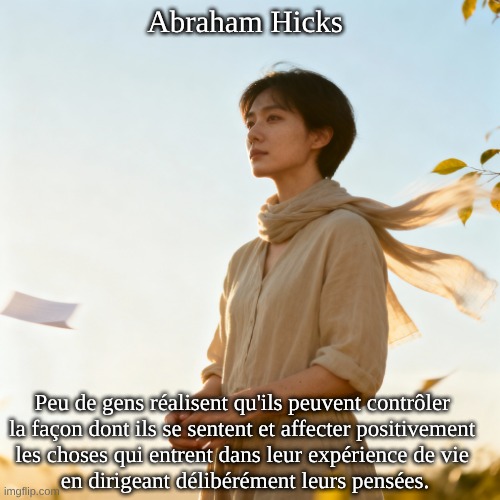 Image: Peter van Geest AI. Signification : La signification de cette affirmation est qu’en choisissant et en dirigeant consciemment leurs pensées, les gens peuvent contrôler leurs sentiments et ainsi avoir une influence positive sur leurs expériences et la réalité. C’est le cœur des enseignements d’Abraham Hicks : chacun est co-créateur de sa propre réalité et peut la changer positivement en dirigeant son attention et son intention. Origine : La source de cette pensée réside chez Abraham Hicks (Esther Hicks comme canal), connu comme professeur de la loi de l’attraction. Il existe de nombreuses citations d’eux qui sont très proches dans la formulation et le contenu, mais la citation exacte ne semble pas apparaître textuellement comme une citation officielle dans leurs livres ou ateliers.