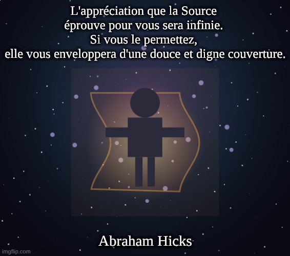 L’appréciation que la Source éprouve pour vous sera infinie. Si vous le permettez, elle vous enveloppera d’une douce et digne couverture.