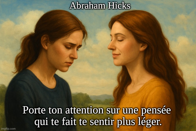 Image: Peter van Geest AI. Signification : Une invitation à s’engager consciemment avec ses pensées. Lorsque vous remarquez que vos pensées deviennent lourdes ou négatives, vous pouvez progressivement porter votre attention sur quelque chose qui vous apaise : un petit souvenir, une source de gratitude, d’espoir. Cela vous permettra de développer la paix intérieure, la clarté et l’équilibre émotionnel. Origine : Esther Hicks (animée par le collectif spirituel « Abraham »). Cette expression apparaît dans ses conférences et ses livres, notamment dans « Demandez et vous recevrez » (2004).