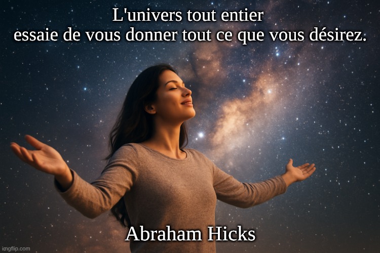 Image: Peter van Geest AI. Signification : Ce que vous désirez et croyez profondément, vous l’attirez. L’univers « essaie » de vous aider, mais votre concentration, vos convictions et vos vibrations déterminent si vous acceptez cette aide ou si vous la bloquez. C’est une pensée encourageante qui incite les gens à penser positivement, à avoir confiance et à formuler clairement leurs désirs. Source : Esther Hicks (avec son entité transmise Abraham), surtout connue pour The Law of Attraction et Ask and It Is Given (2004).