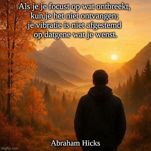 Afbeelding: Peter van Geest AI. Betekenis: De formulering vertoont duidelijke de invloed van moderne spirituele en zelfreflectieve denkers en doet inhoudelijk denken aan ideeën uit de wet van aantrekkingskracht en aan de stoïcijnse psychologie: wat je aandacht geeft, groeit. In die stroming betekent de uitspraak dat wanneer je voortdurend denkt aan “het ontbreken” van iets, je dat gebrek versterkt in plaats van de vervulling ervan te bevorderen. Bron: Hoewel deze specifieke Nederlandse formulering niet letterlijk voorkomt in hun Engelstalige boeken of lezingen, vat ze wel de kern samen van een centrale gedachte in hun leer: de Wet van de Aantrekking. Volgens Abraham Hicks trek je datgene aan waarop je vibratie of aandacht gericht is. Wanneer je vooral focust op het ontbreken van iets dat je verlangt, houd je dat gebrek zelf in stand — omdat je vibratie overeenkomt met “gebrek” in plaats van “vervulling”.