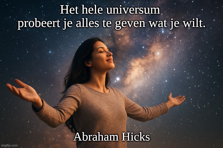 Afbeelding: Peter van Geest AI. Betekenis:Wat je diep van binnen wilt en gelooft, trek je aan. Het universum “probeert” je te helpen, maar jouw focus, overtuigingen en vibratie bepalen of je die hulp toelaat of juist blokkeert. Het is een bemoedigende gedachte die mensen aanzet om positief te denken, vertrouwen te hebben en hun verlangens helder te formuleren. Bron: Esther Hicks (met haar doorgegeven entiteit Abraham), vooral bekend van The Law of Attraction en Ask and It Is Given (2004).