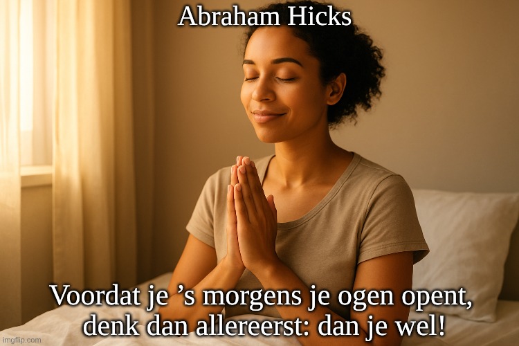 Afbeelding: Peter van Geest AI. Betekenis: De uitspraak vat haar leer samen over het belang van vibratie, dankbaarheid en positieve focus bij het aantrekken van gewenste ervaringen. In de leer van Abraham-Hicks is dit een oefening om je vibratie op een hoge frequentie te zetten zodra je wakker wordt. Door bewust “dank je wel” te denken, stem je jezelf af op gevoelens van waardering en overvloed — wat volgens die filosofie de toon zet voor een positieve dag en gelijksoortige gebeurtenissen aantrekt. Oorsprong: Esther Hicks (met verwijzing naar Abraham-Hicks). Periode: eind 20e – begin 21e eeuw. Bron: geen officieel boekcitaat, maar afkomstig uit haar lezingen en workshops over de Law of Attraction.