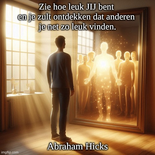 Afbeelding: Peter van Geest AI. Betekenis: Een typisch voorbeeld van hoe Abraham-Hicks psychologische inzichten vertaalt naar hun “Law of Attraction” framework – met de nadruk op dat je realiteit begint bij je eigen gedachten en gevoelens over jezelf. Oorsprong: Esther Hicks is bekend van de Abraham-Hicks teachings – ze channelt naar eigen zeggen een groep bewustzijnsentiteiten genaamd “Abraham” en geeft teachings over de Law of Attraction (Wet van Aantrekking).