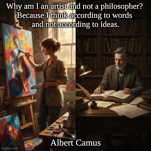 Image: Peter van Geest AI. Significance: These notes by Camus offer insight into his thoughts on life, humanity, and the role of the artist versus the philosopher. It reflects Camus’s views on humanity’s existential conditioning and the role of creativity in understanding the world. Context of Albert Camus:Existentialism and Absurdism: Camus is often associated with existentialism and absurdism, in which he addresses the absurdity of life and the search for meaning. Art versus Philosophy: In his work, Camus often explores the differences between emotional, artistic expression and rational, philosophical approaches to reality. Relevance: This statement emphasizes the value of artistic expression as a way to understand the human experience, which is central to Camus’s philosophy and literary work. Conclusion: Camus’s notes offer a rich resource for understanding his philosophical and artistic views, and the statement reflects his unique perspective on the role of artists in society.