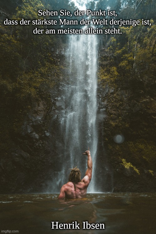 Foto: Karsten-Wnegeart. Bedeutung: Es drückt aus, dass wahre Stärke manchmal darin liegt, allein zu stehen, selbst wenn sich alle gegen einen wenden. Es geht um moralische Stärke, darum, Überzeugungen und Werte nicht aufzugeben, selbst wenn dies zu Isolation, Feindseligkeit und persönlichen Opfern führt. Herkunft: Aus dem Theaterstück „Ein Volksfeind“ (En folkefiende, 1882) des norwegischen Schriftstellers und Dramatikers Henrik Ibsen. Es ist ein Zitat der Hauptfigur, Dr. Thomas Stockmann.