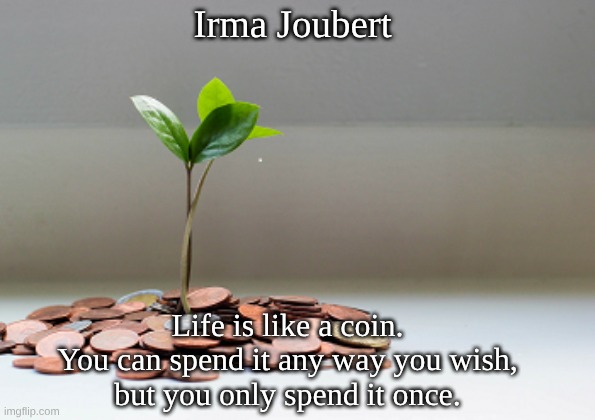 Photo: acuity.nl. Meaning:Inspirational message: The quote means that life is similar to a coin; you have the choice to spend it in different ways, but you only have one chance to do it. Life Choices: This emphasizes the importance of conscious choices in life, because every decision and action has an impact on how you spend your time and life. Origin: In Joubert’s books, themes such as life choices, love and loss are prominent, and the quote reflects her writing style and the deeper messages she tries to convey in her stories. Conclusion: With this quote, Irma Joubert has created a powerful message that encourages readers to consciously deal with their lives and make informed choices.