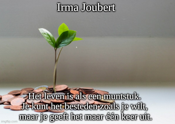 Foto: acuity.nl. Betekenis:Inspirerende boodschap: De quote betekent dat het leven vergelijkbaar is met een muntstuk; je hebt de keuze om het op verschillende manieren te besteden, maar je hebt slechts één kans om het te doen. Levenskeuzes: Dit benadrukt het belang van bewuste keuzes in het leven, omdat elke beslissing en actie een impact heeft op hoe je je tijd en leven doorbrengt. Oorsprong: In Jouberts boeken zijn thema’s zoals levenskeuzes, liefde en verlies prominent aanwezig, en de quote weerspiegelt haar schrijfstijl en de diepere boodschappen die ze in haar verhalen probeert over te brengen. Conclusie: Irma Joubert heeft met deze quote een krachtige boodschap gecreëerd die lezers aanmoedigt om bewust met hun leven om te gaan en weloverwogen keuzes te maken.