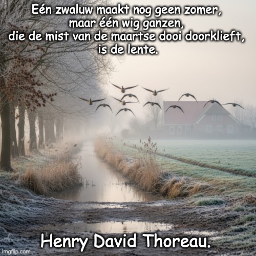 Afbeelding: Peter van Geest AI. Betekenis 🐦☀️: De spreuk “Eén zwaluw maakt nog geen zomer, maar één wig ganzen, die de mist van de maartse dooi doorklieft, is de lente” combineert twee observaties over het begin van seizoenen: “Eén zwaluw maakt nog geen zomer”: Dit is een bekende uitdrukking die betekent dat één positief teken nog geen garantie is voor een grotere, ingrijpende verandering. De eerste zwaluw die je ziet, betekent niet direct dat de zomer al begonnen is; er kunnen nog koude dagen volgen. Het waarschuwt voor voorbarige conclusies op basis van een enkel bewijs. “maar één wig ganzen, die de mist van de maartse dooi doorklieft, is de lente”: Dit deel nuanceert de eerste uitspraak en geeft een veel betrouwbaarder teken van de lente. “Wig ganzen”: Ganzen trekken in een V-vormige formatie (een ‘wig’ of ‘gans in de punt’) en zijn bekend als trekvogels. “Mist van de maartse dooi”: Dit roept het beeld op van het vroege voorjaar, wanneer de winterkou langzaam wijkt, sneeuw smelt en er vaak vochtige, mistige dagen zijn. “Doorklieft”: Dit is een krachtig werkwoord dat suggereert dat de ganzen met hun vlucht de winterse sfeer doorbreken en de weg vrijmaken voor de lente. Samen betekent de spreuk dat hoewel individuele tekens misleidend kunnen zijn, de gezamenlijke en krachtige aanwezigheid van terugkerende trekvogels (zoals ganzen) in het vroege voorjaar een onmiskenbaar en definitief signaal is dat de lente écht is begonnen. Het gaat om de schaal en de aard van het teken. Oorsprong en Auteur 📝🌿: Deze specifieke formulering is geen traditionele Nederlandse weerspreuk in de zin van een oud, anoniem gezegde dat van generatie op generatie is overgeleverd. Hoewel het eerste deel (“Eén zwaluw maakt nog geen zomer”) inderdaad een zeer oude en internationaal bekende spreekwoordelijke uitdrukking is (reeds bekend in het oude Griekenland, toegeschreven aan Aristoteles in zijn Nicomachische Ethiek), is de toevoeging over de ganzen en de mist van de maartse dooi van moderner literaire aard. Het klinkt als een fragment uit een gedicht, een liedtekst, of een prozatekst met een dichterlijke inslag. Na onderzoek blijkt deze specifieke zin een directe vertaling te zijn van een passage uit het werk van de beroemde Amerikaanse natuurkundige en filosoof Henry David Thoreau. Auteur:Henry David Thoreau (1817-1862) Werk: De zin is afkomstig uit zijn invloedrijke werk “Walden; or, Life in the Woods” (1854). De oorspronkelijke Engelse tekst luidt: “One swallow does not make a summer, but one wedge of geese, cleaving the / March mist high above the alder-swamp, is a sign of spring.” Thoreau stond bekend om zijn diepe observaties van de natuur en zijn filosofische reflecties daarop. Hij bracht twee jaar, twee maanden en twee dagen door in een hut aan Walden Pond om de natuur te bestuderen en te leven volgens zijn principes van eenvoud en zelfvoorziening. Deze spreuk past perfect bij zijn stijl: nauwkeurige observatie van de natuur, gecombineerd met diepgang en poëzie. Dus, hoewel “één zwaluw geen zomer maakt” oeroud is, is de toevoeging die er een complete en prachtige spreuk over de lente van maakt, te danken aan de hand van Henry David Thoreau.