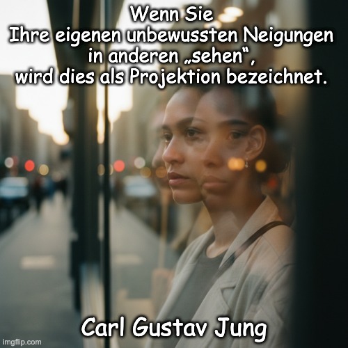 Bild- Peter van Geest AI. Bedeutung 🔎: Das Zitat beschreibt den psychologischen Mechanismus der „Projektion“: Man schreibt (oft unbewusst) die eigenen Neigungen, Wünsche, Ängste oder Schwächen anderen zu. Funktion: Abwehrmechanismus zur Reduzierung innerer Spannungen oder zum Schutz des Selbstbildes. Beispiele: Eifersucht → Verdacht auf Illoyalität oder Neid bei anderen. Perfektionismus → Beurteilung anderer als „schlampig“ oder „unprofessionell“. Es gibt auch positive Projektion: Man idealisiert Eigenschaften in anderen, die man sich selbst (noch) nicht eingesteht. 🧭 Ursprung: Psychoanalyse (Anfang des 20. Jahrhunderts). Sigmund Freud führte die Projektion als Mechanismus ein und beschrieb sie, unter anderem in seiner Analyse der Paranoia (Fall Schreber, 1911) und in späteren Texten. Anna Freud systematisierte die Projektion als einen der Abwehrmechanismen (Das Ich und die Abwehrmechanismen, 1936). Carl Gustav Jung entwickelte die Idee im Kontext des „Schattens“ (z. B. in Aion, 1951): Was man an sich selbst ablehnt, sieht man oft in anderen. Melanie Klein (1946) und später W. R. Bion erweiterten sie mit der „projektiven Identifizierung“ (verwandt, aber nicht identisch). Etymologie: über das Französische/Englische „projection“ vom lateinischen „proicere“ („vorwärts werfen“). ✍️ Autor dieses Zitats: Diese englische Formulierung ist kein nachweisbares, festes Zitat eines einzelnen Autors; es handelt sich vielmehr um eine gängige (paraphrasierte) Definition von „Projektion“. Sie wird online mitunter Carl Jung zugeschrieben, doch findet sich diese genaue Formulierung nicht in seinen gesammelten Werken.Daher ist sie als zusammenfassende Beschreibung und nicht als wörtliches Zitat von Jung oder Freud zu verstehen.