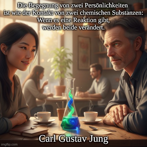 Bild: Peter van Geest AI. 🧠 Bedeutung:Chemische Metapher ⚗️: So wie zwei Substanzen bei Kontakt reagieren und sich beide verändern, beeinflussen sich auch zwei Menschen gegenseitig, wenn eine echte „Chemie“ besteht. Gegenseitigkeit 🔁: Veränderung ist nicht einseitig; beide erleben eine Verschiebung – in ihrer Perspektive, ihren Gefühlen, Überzeugungen oder ihrem Verhalten. Bedingung: „Wenn eine Reaktion stattfindet“ ✅: Nicht jede Begegnung ist transformativ; Veränderung findet nur statt, wenn echte Interaktion, Resonanz oder Spannung entsteht. Neutral/ambivalent ⚖️: Die Transformation kann positiv (Wachstum, Erkenntnis) oder herausfordernd (Konflikt, Konfrontation) sein – ist aber immer prägend. 🧩 Ursprung: Zugeschrieben an: C.G. Jung, Ursprung 🗂️: Oft verbunden mit „Der Mensch auf der Suche nach seiner Seele“ (1933) oder Essays im jungianischen Kontext. Eine exakte Quellenangabe ist in der Literatur und in Online-Zitaten oft nicht eindeutig; sie ist ein zentraler Gedanke Jungs, der sein Denken über Beziehung, Übertragung/Gegenübertragung und alchemistische Symbolik zusammenfasst. Orientalisch/Germanisch 🇩🇪: Im Deutschen wird es oft so paraphrasiert: „Die Begegnung zweier Personen ist wie der Kontakt zweier chemischer Substanzen: Wenn eine Reaktion stattfindet, verändern sich beide.“ (Praktischer Hinweis: Obwohl die Zuschreibung an Jung weithin akzeptiert ist, lässt sich eine genaue Seitenangabe in seinen Hauptwerken schwer verifizieren; das Zitat sollte daher eher als authentische Zusammenfassung seines Denkens denn als Satz mit einer festen Quellenangabe betrachtet werden.) 👤 Über den Autor:Carl Gustav Jung: Schweizer Psychiater, Begründer der analytischen Psychologie. Schlüsselideen: Kollektives Unbewusstes, Archetypen, der Weg der Individuation, Synchronizität, Symbolik und Alchemie als psychologische Sprache. 🧭 Anwendung und Kontext: Psychotherapie 🛋️: Bezeichnet die wechselseitige Beeinflussung zwischen Therapeut und Klient (Übertragung/Gegenübertragung), in der beide lernen und sich verändern. Beziehungen ❤️: In Freundschaft, Liebe oder Zusammenarbeit verändern Menschen einander durch authentische Begegnungen, nicht durch oberflächlichen Kontakt. Team/Organisation 🤝: Kreative Spannung oder „Chemie“ kann Kulturen und Individuen nachhaltig prägen. 🔎 Nuancen und Missverständnisse: Nicht jeder Kontakt führt zu Veränderung: Transformation geschieht nur durch echtes Engagement, Konflikt, Resonanz oder Verletzlichkeit. Keine romantische Exklusivität: Dies gilt gleichermaßen für professionelle oder konfliktbehaftete Interaktionen. Keine „Machtmetapher“: Sie betont Gegenseitigkeit, nicht Dominanz oder einseitigen Einfluss. 📚 Kurze Quellenangaben: C.G. Jung – Der Mensch auf der Suche nach seiner Seele (1933) [häufig zitierte Quellenangabe]. Jungs Essays über Übertragung und Alchemie für den konzeptionellen Kontext.
