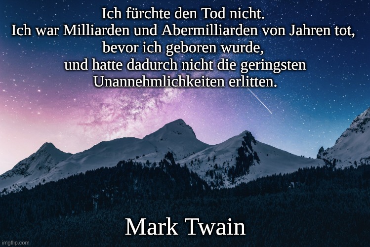 Foto: Benjamin Voros. Bedeutung: Der Sprecher behauptet, keine Angst vor dem Tod zu haben. Ein Paradoxon: Vor seiner Geburt existierte er Milliarden von Jahren ohne Bewusstsein und empfand dies als „keinerlei Unannehmlichkeit“. Der Tod wird somit als furchtlos dargestellt, da er keine Veränderung gegenüber dem vorweltlichen Zustand bedeuten würde. Autor und Zuverlässigkeit der Zuschreibung: Zuschreibung an Mark Twain:Dieses Zitat wird häufig Mark Twain zugeschrieben. Tatsächliche Quelle: Es gibt keine verlässliche Primärquelle (keine Briefe, Notizen oder Werke von Twain), die dieses Zitat belegt. Es scheint sich um eine jener falschen Zuschreibungen zu handeln, die im Internet im Laufe der Jahre ohne faktische Grundlage populär geworden sind. Bekanntes: Von Twain sind viele gut dokumentierte Zitate bekannt (z. B. „Die Gerüchte über meinen Tod sind stark übertrieben“), aber diese spezielle Formulierung fehlt in verlässlichen Sammlungen oder wissenschaftlichen Quellen über Twain. Englische Version: I do not fear death. I had been dead for billions of years before I was born, and I had not suffered the slightest discomfort because of it.