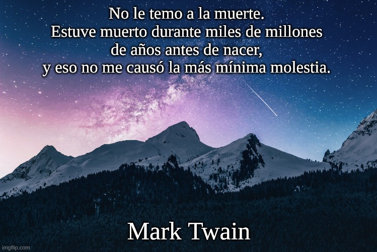 Paradoja: Antes de nacer, existió durante miles de millones de años sin consciencia, y experimentó esto como “ninguna molestia en absoluto”. Por lo tanto, la muerte se presenta como algo sin miedo, porque no representaría ningún cambio con respecto a la fase anterior a la vida. Autor y fiabilidad de la atribución: Culpa o atribución a Mark Twain: Esta cita se atribuye a menudo a Mark Twain. Fuente real: No existe ninguna fuente primaria fiable (ni cartas, notas ni obras de Twain) que respalde esta cita. Parece ser una de esas atribuciones erróneas en internet que se han popularizado con los años sin ninguna base factual. Lo que se sabe: Twain tiene muchas citas bien documentadas (p. ej., “Los informes sobre mi muerte son muy exagerados”), pero esta frase específica no se encuentra en colecciones fiables ni en fuentes académicas sobre Twain. Versión en inglés: I do not fear death. I had been dead for billions of years before I was born, and I had not suffered the slightest discomfort because of it.