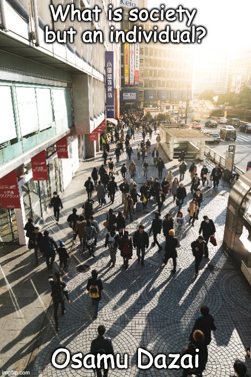 Photo: Ryoji Iwata. Meaning📌 : The saying expresses that “society” is not an abstract, independent entity, but essentially consists of individuals (their judgments, fears, power, and social control). In context, it also means: people sometimes hide behind “society” to actually package their own disapproval/coercion as something bigger. “Society won’t stand for it” → “you (and people like you) will not allow it.”🧾 Origin: The core formulation “What is society but an individual?” comes from Osamu Dazai’s novel: 『人間失格』 (Ningen Shikkaku) (often translated as No Longer Human). 👤 Author:Osamu Dazai (1909–1948) is the author of the source passage (the thought “What is society but an individual?”).
