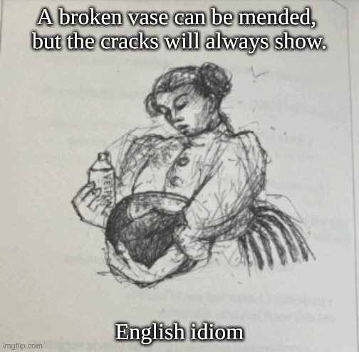Image: fbtwentsespreuken. Meaning: Once something is broken, it can never be completely repaired. There will always be something (a “shard”) missing or flawed.