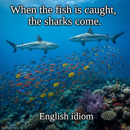 Image: Peter van Geest AI. Meaning: The expression means that whenever someone is successful or has achieved something worthwhile, there are always opportunists (the “sharks”) who want to take advantage of that situation. It emphasizes the idea that success often attracts people who want to profit from the efforts of others. Origin: The origin of this expression is not precisely traceable, but the use of fish and shark metaphors is widespread in English language and literature. The idea of opportunism is a theme that often appears in stories and proverbs, giving this expression a timeless relevance. Author: This proverb has no specific author, as it is a popular expression used colloquially. It is an example of a universal concept that occurs across cultures and languages, comparable to similar sayings in other languages.