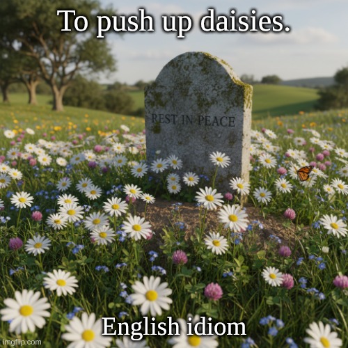 Image: Peter van Geest AI. Meaning: Is a euphemism for being dead and buried. It suggests that the body is decomposing in the ground, allowing daisies and other flowers to grow above it. The phrase is believed to have originated in the early 20th century. It is derived from the imagery of flowers, particularly daisies, growing over a grave. The exact author or first usage is not clearly documented, but it has been popularized in literature and colloquial speech. Usage: Commonly used in a humorous or light-hearted context to discuss death without being overly morbid. Example: “After that long illness, he finally pushed up daisies.”Cultural References: The idiom has appeared in various forms of media, including literature, films, and songs, often to convey themes of mortality in a less serious manner. Conclusion: “To push up daisies” serves as a clever way to address the topic of death, using nature and flowers as a metaphor to soften the impact. 🌱