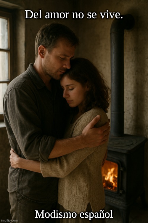 Imagen: Peter van Geest AI. Significado: El amor por sí solo no brinda calor si no hay alimento, refugio ni recursos. El dicho, por lo tanto, resalta la actitud práctica y realista ante la vida de los habitantes de la región: los sentimientos son agradables, pero las cuestiones prácticas también importan.