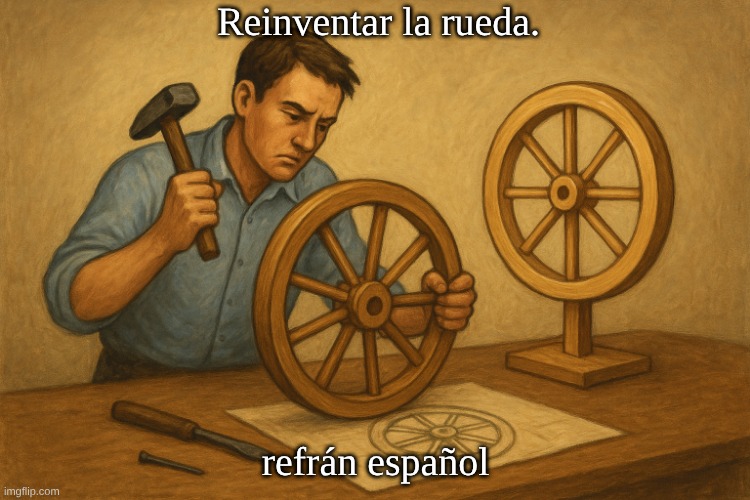 Imagen: Peter van Geest AI. Significado: Alguien pierde tiempo y esfuerzo en algo que ya ha sido bien inventado o desarrollado por otros. Origen: La expresión proviene de una metáfora: la rueda es uno de los inventos humanos más antiguos e importantes. No es un dicho popular antiguo, pero probablemente se originó en el siglo XIX, principalmente en contextos comerciales, técnicos y educativos adoptados del inglés.
