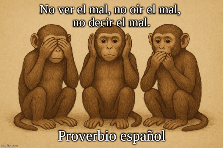 Imagen: Peter van Geest AI. Significado: 1. Moral/ético: No se debe ver, oír ni hablar del mal, es decir, no involucrarse en malas acciones ni en negatividad. 2. Pragmático/irónico: Fingir que no se ve, oye ni se dice nada para evitar problemas, es decir, ignorar conscientemente el mal o mantenerse al margen. Origen: La expresión proviene de Japón, donde ya en el siglo XVII se asociaba a una escultura del santuario Tōshō-gū en Nikkō. Allí hay tres tallas de monos que representan la regla.