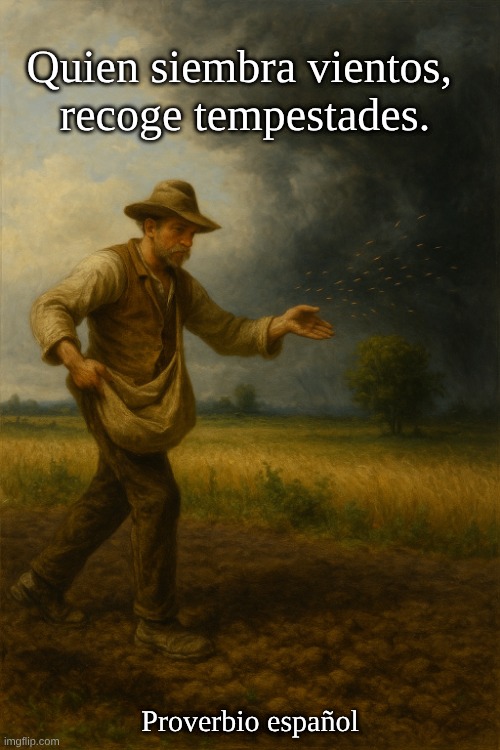 Imagen: Peter van Geest AI. Significado: Quien causa disturbios, a menudo sufre las peores consecuencias y se convierte en víctima de ellos. Fuente: Biblia, Oseas 8:8 (Traducción del Nuevo Mundo).