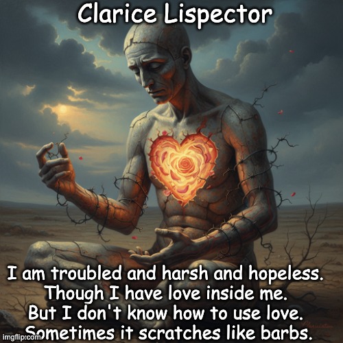 Image: Peter van Geest AI.  📖 Meaning and Interpretation:  This quote is rich in meaning and touches upon universal human experiences: “I am troubled and hard and hopeless.” Anguished: This indicates a deep inner conflict, a sense of anxiety or torment. It suggests that the speaker is constantly plagued by thoughts or emotions. Hard: Can refer to a defensive attitude, a wall erected to protect oneself from pain, or a sense of rigidity or inflexibility in dealing with life. It can also indicate life experiences that have made the speaker “hard.” Hopeless: A sense of despair or the lack of a way out, which may reflect deep melancholy or pessimism. “Although I have love within me.” This sentence introduces a powerful paradox. Despite the negative feelings (troubled, hard, hopeless), the speaker acknowledges the presence of love. This suggests that love is an intrinsic part of one’s being, a potential or an present force, even when overshadowed by other emotions. “But I don’t know how to use love.” This is the core of the struggle. It is not that love is lacking, but rather the ability to effectively express, share, or be guided by this love is absent. It can indicate: Insecurity: Fear of showing love for fear of rejection or pain. Powerlessness: The feeling of losing control when love is involved. Lack of understanding: Not knowing how to navigate love in relationships or in one’s own life. “Sometimes it scratches like barbs.” This is a very poetic and painful metaphor. Love, which is supposed to be soft and healing, is described here as something that “scratches” and has “barbs.” This can mean: The Pain of Love: Love can lead to jealousy, loss, disappointment, or the feeling of being stuck, which is just as painful as physical wounds. Self-destruction: The way the speaker attempts to express or experience love can be destructive to themselves or to others. Unfulfilled Desires: The presence of love that cannot be expressed can cause inner pain, like a constant irritation. 💭 General Interpretation: The quote speaks about the tragedy of human existence, where deep emotions such as love can be intertwined with fear and suffering. It highlights the internal struggle of someone who carries the potential for love within themselves but does not know how to handle it, causing that same love to become a source of pain and frustration. It is a reflection on the vulnerability and complexity of the human psyche. ✒️ Author and Origin: This quote is widely attributed to Clarice Lispector, one of the most influential Brazilian writers of the 20th century. Her work is known for its profound psychological exploration of human existence, love, fear, and the inner struggle. She had a unique, introspective style that often explored the complexity of emotions and the impossibility of fully expressing them. Work: Although the quote often circulates without a specific source, it is associated with her characteristic themes. Many of her writings, particularly her novels and short stories such as “The Passion According to G.H.” or “The Hour of the Star,” contain similar thoughts on the duality of love and suffering. It is difficult to pinpoint a single exact source, as it captures the essence of her philosophy so well. This quote is a striking summary of the depth and melancholy that are so characteristic of Clarice Lispector’s work.
