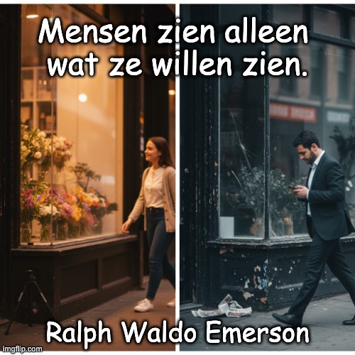 Afbeelding- Peter van Geest AI. Betekenis 🧠:Waarneming is selectief: we merken vooral op wat past bij onze verwachtingen, overtuigingen en ervaringen. Onze “mindset” fungeert als filter (denk aan confirmation bias). Wie zijn perspectief verruimt of zich anders voorbereidt, ziet ook meer/anders. Auteur 👤: Ralph Waldo Emerson (1803–1882) — Amerikaanse essayist, dichter en filosoof; belangrijke stem van het transcendentalisme. Oorsprong/bron 📜: Het citaat wordt wijdverbreid aan Emerson toegeschreven. De exacte vindplaats is niet eenduidig te herleiden tot één passage; het verwoordt een kerngedachte in zijn essays (bijv. Nature, 1836; The Conduct of Life, 1860): onze innerlijke gesteldheid kleurt wat en hoe we zien. Context 🧭: In de transcendentalistische traditie benadrukt Emerson dat intuïtie en innerlijke ontwikkeling bepalen hoe de wereld zich aan ons toont (top-down waarneming). Toepassing ✅ : Onderzoek je aannames en zoek actief naar informatie die je overtuigingen tegenspreekt. Kijk vanuit meerdere perspectieven (diverse bronnen / achtergronden). Train aandacht en opmerkzaamheid (mindfulness) om je “perceptiefilter” flexibeler te maken.