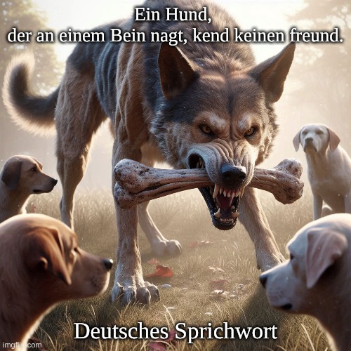 Bild: Peter van Geest AI. Bedeutung: Das Sprichwort besagt, dass jemand, der etwas Wertvolles besitzt, oft egoistisch wird und nicht bereit ist zu teilen, selbst mit Freunden. Wie ein Hund, der einen Knochen vehement verteidigt und sogar seine Freunde verjagt, so können auch Besitztümer Menschen verändern. Es verweist auf die egoistische Seite der menschlichen Natur, wenn es um Eigeninteressen geht. Ursprung: Es handelt sich um ein altes Volkssprichwort (16., 17. Jahrhundert) ohne bekannten Autor. Solche Sprichwörter entstammen der Volksweisheit und wurden mündlich überliefert, bevor sie schriftlich festgehalten wurden. Es gehört zum kollektiven Kulturerbe der niederländischen und deutschen Sprache.