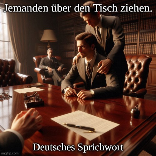Bild: Peter van Geest AI. Bedeutung: Wird im Deutsch verwendet, um auszudrücken, dass man jemanden unter Druck setzt, etwas zu akzeptieren – zum Beispiel eine Vereinbarung, eine Entscheidung oder eine Verpflichtung. Oft impliziert dies ein gewisses Maß an Zwang oder Einschüchterung: Man „zieht” die andere Person buchstäblich oder im übertragenen Sinne über den Tisch, sodass sie keine andere Wahl hat, als sich einem zu fügen. Herkunft: Der Ausdruck hat seinen Ursprung in der Handels- und Rechtspraxis des 18./19. Jahrhunderts. Damals wurden Verträge und Schuldscheine oft auf einem großen Tisch ausgebreitet. Wenn ein Schuldner oder Handelspartner sich weigerte zu unterschreiben, konnte er physisch über den Tisch gezogen und zur Unterzeichnung des Dokuments gezwungen werden. Das Bild, dass jemand buchstäblich über den Tisch gezogen wird, wurde später zu einer Metapher für jede Form von Zwang oder harten Verhandlungen. Es gibt keinen einzelnen Autor oder Erfinder dieses Sprichworts; es handelt sich um eine idiomatische Redewendung, die sich organisch aus den Deutsche Handels- und Rechtstraditionen entwickelt hat. Es handelt sich also um eine Volksweisheit ohne konkrete Quelle.