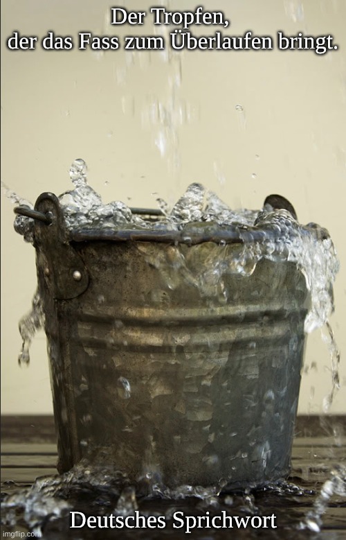Foto: papillon60. Bedeutung: Der letzte in einer Reihe von Ärgernissen, Problemen oder Ereignissen, der dazu führt, dass jemandem die Geduld ausgeht oder eine Situation unhaltbar wird. Das Bild ist das eines Eimers, der langsam mit Tropfen gefüllt wird – jeder Tropfen für sich ist unbedeutend, aber letztendlich sorgt ein letzter Tropfen dafür, dass der Eimer überläuft. So kann ein kleines Ereignis an sich harmlos erscheinen, aber wenn es auf eine lange Reihe von Problemen folgt, kann es die Situation unhaltbar machen. Es wird verwendet, um auszudrücken, dass die Geduld, Toleranz oder Fähigkeit einer Person, etwas zu ertragen, vollständig erschöpft ist. Herkunft: Ein sehr alter Spruch, dessen genaue Herkunft und Urheber nicht mit Sicherheit festgestellt werden können. Der Ausdruck stammt wahrscheinlich aus dem Lateinischen: „gutta cavat lapidem” (ein Tropfen höhlt den Stein), aber die spezifische Form mit dem Eimer scheint niederländischen oder germanischen Ursprungs zu sein.