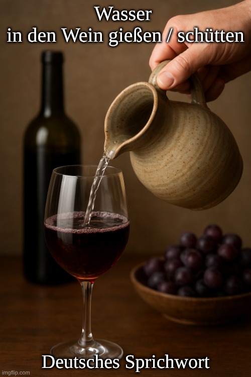 Bild: Peter van Geest AI. Bedeutung: Einen Kompromiss schließen, nachgeben oder seine Forderungen mäßigen, um eine Einigung zu erzielen. Man „verdünnt” sozusagen seine eigenen Wünsche, um Zusammenarbeit oder Frieden zu ermöglichen. Herkunft: Traditionelles Sprichwort. Der Ausdruck stammt aus der alten europäischen Trinkkultur. In der Antike (vor allem bei den Griechen und später auch bei den Römern) wurde Wein fast immer mit Wasser verdünnt. Reinen Wein zu trinken galt als unzivilisiert oder ungesund. Wer bereit war, Wasser in seinen Wein zu geben, zeigte damit, dass er bereit war, Ruhe zu bewahren, Konflikte zu vermeiden oder sich zurückhaltender zu verhalten. Im Mittelalter und in der frühen Neuzeit blieb diese Bildsprache erhalten: Wasser zum Wein hinzufügen schwächt den Geschmack → im übertragenen Sinne: man schwächt seinen Standpunkt, um ihn für andere akzeptabel zu machen.