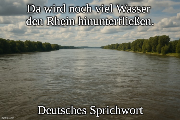 Bild: Peter van Geest AI. Bedeutung: Es wird noch viel Zeit vergehen, bevor etwas geschieht, oder es müssen noch viele Entwicklungen stattfinden, bevor es soweit ist. Die Bildsprache ist einfach: Der Rhein ist ein großer, ständig fließender Fluss. Wenn man sagt, dass noch viel Wasser den Rhein hinunterfließen muss, meint man, dass noch viel Zeit vergehen muss, so wie das Wasser, das unaufhörlich fließt und niemals aufhört. Herkunft: Das Sprichwort stammt aus dem Volksmund und ist bereits aus dem 19. Jahrhundert, möglicherweise sogar älter. Es ist vergleichbar mit alten Sprichwörtern, die Zeit und Flüsse miteinander verbinden (wie in mehreren europäischen Sprachen). Flüsse dienen traditionell als Metapher für den Lauf der Zeit.