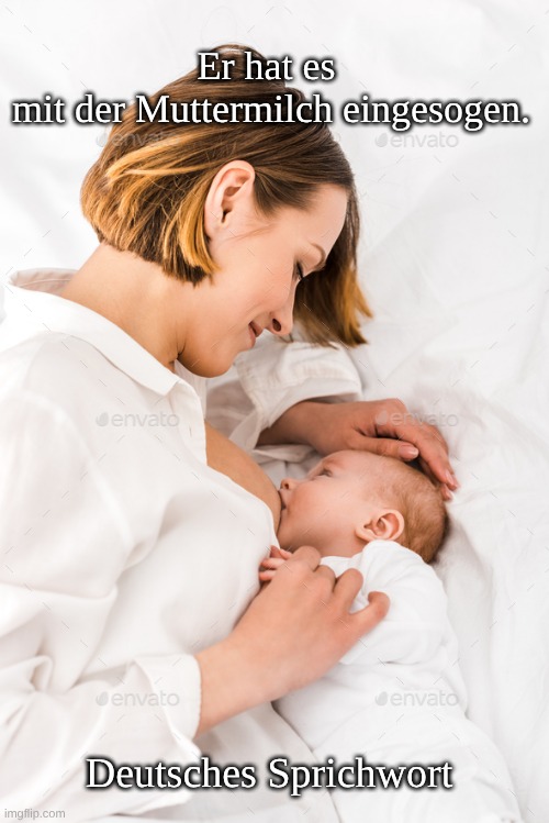 Foto: freepik.com. Bedeutung: Dass jemand etwas von frühester Kindheit an mitbekommen, eingeprägt oder gelernt hat – als hätte er es mit der Muttermilch aufgesogen. Es bezieht sich auf die Zeit, in der Babys noch nicht selbstständig essen können und gestillt oder mit dem Löffel (Breilöffel) gefüttert werden. Im übertragenen Sinne bedeutet es also, dass etwas so tief verwurzelt ist, dass es ein untrennbarer Teil des Denkens oder Charakters einer Person ist. Ursprung: liegt in der Umgangssprache des 17. bis 18. Jahrhunderts, in der das physische Bild eines Babys, das mit Muttermilch oder einem Löffel gefüttert wird, auf den geistigen Prozess der frühen Konditionierung übertragen wurde.