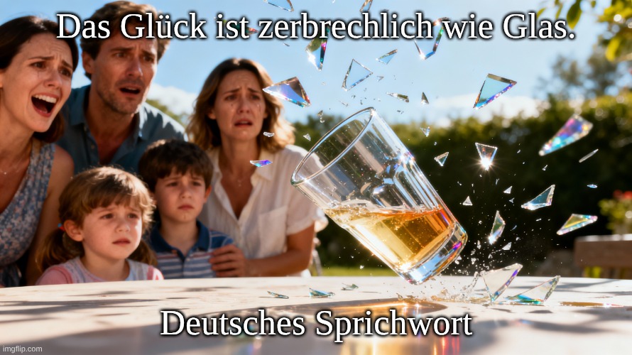 Bild: Peter van Geest AI. Bedeutung: Die Kernaussage: Glück ist zerbrechlich und vergänglich; was man jetzt hat, kann im Nu verloren gehen, wie ein Glas, das einem aus der Hand fällt und in Scherben zerspringt. Der Gebrauch schwingt oft eine Mischung aus Ernsthaftigkeit und Vorsicht mit: Genieße das Leben, aber sei dir bewusst, dass Wohlstand weder selbstverständlich noch von Dauer ist. Ursprung: Es gibt keinen bekannten Erfinder oder Autor; es gilt als anonymes Sprichwort, wie viele andere deutsches Redewendungen aus der frühen Neuzeit oder noch früheren Epochen. Als freie Formulierung; dies wird vor allem als eigenständige Aussage verwendet, nicht als klassisches Sprichwort.
