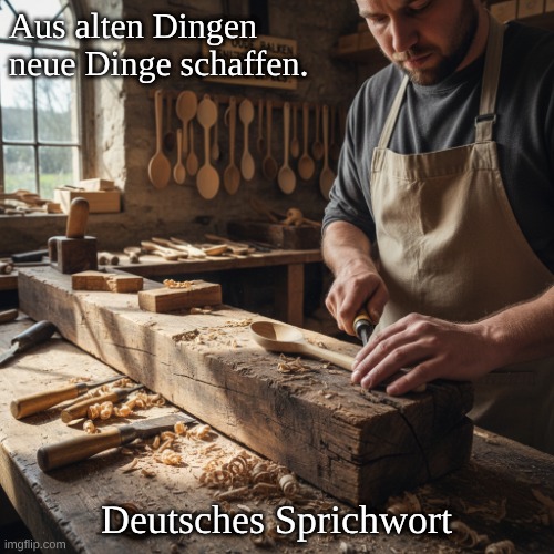 Bild: Peter van Geest AI. Bedeutung: Kernaussage: Der Ausdruck besagt, dass man aus alten oder gebrauchten Materialien neue und nützliche Gegenstände herstellen kann. Er betont die Wichtigkeit von Wiederverwendung, Kreativität und Einfallsreichtum. Ursprung: Dieses Sprichwort stammt aus dem deutschen Handwerk und hat seinen Ursprung in traditionellen Handwerkspraktiken, wo Holz und andere Materialien oft wiederverwendet wurden, um neue Produkte herzustellen. Es spiegelt einen in vielen Gesellschaften verbreiteten kulturellen Wert wider, nämlich die Idee der Nachhaltigkeit und die Wertschätzung dessen, was man hat. Autor: Der genaue Ursprung oder Autor dieses Sprichworts lässt sich schwer zurückverfolgen, da es sich um überlieferte Volksweisheit handelt. Solche Sprichwörter werden oft nicht einem einzelnen Autor zugeschrieben, sondern entstehen aus den kollektiven Erfahrungen und der Weisheit einer Gemeinschaft. Fazit: Dieses Sprichwort ist ein schönes Beispiel dafür, wie traditionelle Weisheit uns zu Kreativität und einem nachhaltigen Umgang mit den uns zur Verfügung stehenden Ressourcen inspirieren kann. 🌳✨