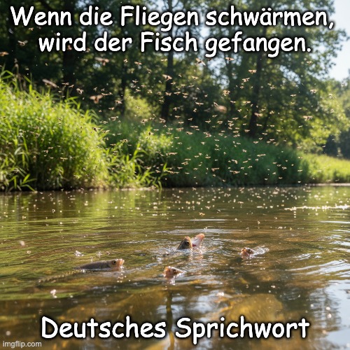 Bild- Peter van Geest AI. Bedeutung: Der Ausdruck bedeutet, dass es bei günstigen Bedingungen (z. B. wenn sich Fliegen über dem Wasser versammeln) ein guter Zeitpunkt ist, Chancen zu ergreifen oder etwas zu erreichen. Es deutet darauf hin, dass es Zeiten gibt, in denen sich Opportunismus auszahlt, und dass man Situationen ausnutzen sollte, in denen andere verwundbar sind. Ursprung: Dieses Sprichwort stammt aus der deutschen Folklore und verwendet eine Metapher im Zusammenhang mit der Natur, wo das Sammeln von Fliegen ein Zeichen für Aktivität ist, die Fische anlockt. Die Vorstellung, dass sich in geschäftigen oder aktiven Zeiten Chancen ergeben, ist ein universelles Thema, das in vielen Kulturen zu finden ist. Autor: Für diesen Ausdruck ist kein konkreter Autor bekannt, da es sich um ein traditionelles Sprichwort handelt, das sich im Laufe der Jahre in der deutschen Sprache verbreitet hat. Es ist ein Beispiel für Volksweisheit, das die menschliche Natur und die soziale Dynamik widerspiegelt.