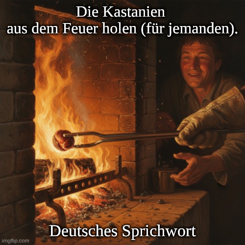 Bild: Peter van Geest AI. 🧠 Bedeutung und Nuancen: – Jemand erledigt das Gefährliche/Heikle für eine andere Person. – Der Helfer trägt das Risiko (sich „die Finger verbrennen“), der Begünstigte erntet den Nutzen. – Tonfall: häufig kritisch oder ironisch; kann aber auch Anerkennung für Einsatz/Loyalität ausdrücken (z. B. in Teams). 🐒 Herkunft (Etymologie): – Geht auf die französische Fabel „Le Singe et le Chat“ (Der Affe und die Katze) von Jean de La Fontaine (1679) zurück. – Inhalt: Der Affe (Bertrand) überredet die Katze (Raton), geröstete Kastanien aus dem Feuer zu ziehen; die Katze verbrennt sich, der Affe frisst die Kastanien. 🐒🐱🌰🔥 – Daraus entstand im Französischen die Redewendung „tirer les marrons du feu“. – Ins Deutsche als feste Wendung übernommen; im Deutschen seit dem 18./19. Jahrhundert belegt. ✍️ Urheber: – Kein einzelner deutscher „Urheber“ der Redewendung. – Literarische Quelle/Popularisierung: Jean de La Fontaine. – Das Motiv existiert in älteren europäischen Fabeltraditionen, wurde aber durch La Fontaine sprichwörtlich. ✅ Fazit: Die Redewendung beschreibt das riskante Erledigen einer heiklen Aufgabe zugunsten anderer — historisch verankert in La Fontaines Fabel und bis heute ein Bild für Loyalität, aber auch für Ausnutzung.