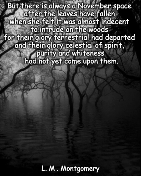 But there is always a November space after the leaves have fallen when she felt it was almost indecent to intrude on the woods for their glory terrestrial had departed and their glory celestial of spirit and purity and whiteness had not yet come upon them.