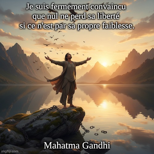 Signification : Responsabilité personnelle : Gandhi soulignait souvent le rôle des individus dans leur propre vie et la nécessité d’assumer la responsabilité de leurs actes. Liberté et force intérieure : cette citation s’inscrit dans sa philosophie plus large de non-violence et d’autodiscipline, selon laquelle il croyait que la véritable liberté découle de la force intérieure. Origine : Contexte historique : Gandhi était une figure de proue du mouvement pour l’indépendance de l’Inde et ses idées sur la liberté et la responsabilité ont été influencées par son expérience du colonialisme et de l’oppression. Influences philosophiques : Ses pensées ont également été influencées par diverses philosophies, notamment celles de la Bhagavad Gita, de Tolstoï et de Thoreau. Impact : Inspiration pour les autres : Les déclarations et les philosophies de Gandhi ont eu un impact mondial et continuent d’inspirer les gens dans leur lutte pour la liberté et la justice. Application : Le message sur la responsabilité personnelle et le pouvoir de la volonté est pertinent dans divers contextes, du développement personnel aux mouvements sociaux et politiques. Conclusion : Mahatma Gandhi est souvent cité comme l’auteur de cette citation, et son œuvre et ses philosophies sur la liberté, la responsabilité et la non-violence restent une source d’inspiration importante pour beaucoup. Cette citation reflète sa conviction que les individus ont le pouvoir de façonner leur propre vie et leur liberté par leurs choix et leurs actions.