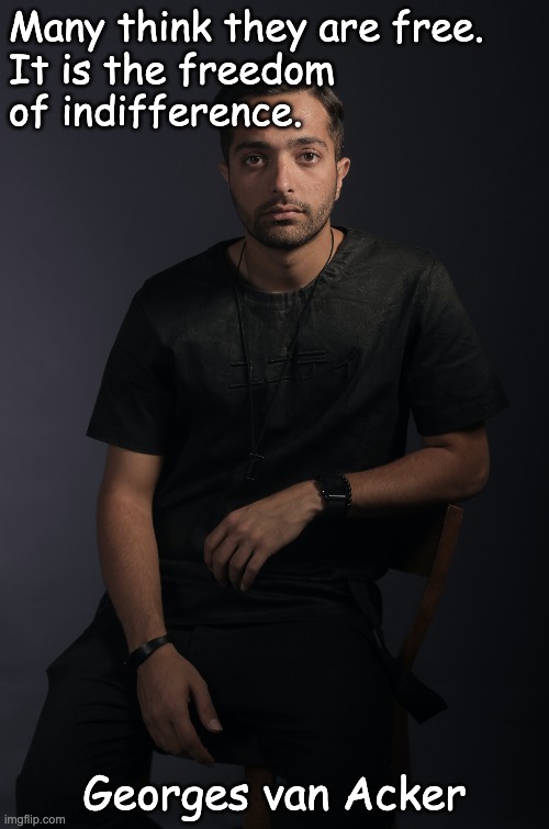 Photo: Hadi Yazdi. Meaning 📚: This quote touches upon deep philosophical ideas about freedom and the human condition. The core is that what many experience as freedom may actually be a form of indifference. Let’s break that down: Freedom: Traditionally associated with autonomy, the ability to make choices and act without coercion. Indifference: This implies a lack of interest, involvement, or care. When the two are combined, the quote suggests that people feel free because they do not concern themselves with certain matters, are not faced with difficult choices, or perhaps even do not foresee the implications of their actions. It is a “freedom from”—being free from responsibility, free from depth, free from genuine involvement. This type of freedom can be superficial and may mask a deeper lack of true autonomy or critical thinking. It can also refer to the freedom that arises from not being aware of the chains one carries, or not seeing the necessity to act or take a stand. 🌍 Origin and Author: The quote is often attributed to Georges van Acker. Georges van Acker (1940–2022) was a Belgian philosopher, psychoanalyst, and writer. He was known for his in-depth analyses of the human psyche, society, and philosophy, often from a Lacanian perspective. His work frequently dealt with themes such as desire, subjectivity, power, and, indeed, freedom. Context of the quote: This quote fits well within Van Acker’s body of thought, who took a critical look at modern society and the way individuals position themselves within it. He would argue that true freedom is often accompanied by consciousness, responsibility, and the willingness to grapple with complex issues, rather than fleeing into indifference or passivity. The “freedom of indifference” is then not true freedom, but rather an illusion or a disguised form of powerlessness.