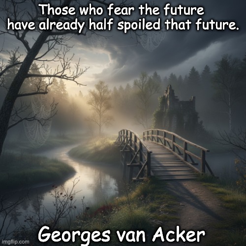 Image: Peter van Geest AI. Meaning 📚: The quote “He who fears the future has already half spoiled that future” means that the way we look at the future and how we feel about it has a direct influence on how that future will unfold. Fear as a self-fulfilling prophecy: If you are constantly afraid of what is to come, that fear influences your actions, decisions, and state of mind. You might miss opportunities, be less open to new experiences, or worry unnecessarily about things that might never happen. Negative influence on the present: Fear of the future robs you of the joy and possibilities in the present. You are so focused on potential negative outcomes that you overlook the positive aspects of today. Reduced resilience: Fear can reduce your resilience. If you are already “half spoiled” by fear, you are less well-equipped to deal with challenges when they actually arise. In short, the quote encourages a proactive and positive attitude towards the future, because our mental attitude is a powerful force that helps shape our reality. 🧐 Origin and Author:Georges van Acker: This quote is very often attributed to Georges van Acker (1913-1994). He was a Belgian priest, writer, and philosopher. He was known for his wisdom and aphorisms. Many of his sayings reflect a deep insight into human psychology and life. Locations: The quote can be found in various collections of sayings and wisdom, often with Georges van Acker listed as the author. It is a thought that, although often attributed to one person, reflects a universal truth that recurs in different cultures and philosophies. ✨ Conclusion: It is a powerful reminder not to get bogged down in fear, but to face the future with openness and resilience.
