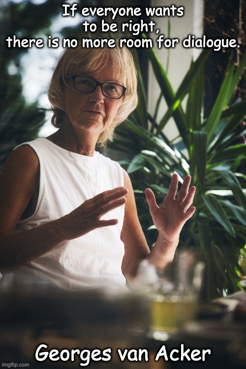 Photo: Julian Hacker. Meaning: Anyone solely intent on being right uses a conversation as a platform rather than an exchange. A true dialogue presupposes openness and a willingness to listen and, if necessary, change one’s point of view. Dogmatism and dialogue are mutually exclusive. Origin: The aphorism was presumably inspired by Van Acker’s personal experiences in the left-wing labor movement, where ideological rigidity and internal squabbling over “being right” were a familiar phenomenon. Source: Most likely from the collection of aphorisms ¨Bezeten van vrijheid¨ (1987). The quote also circulates in ¨Het Grootstecitatenboek ter Wereld¨ by Gerd De Ley (Lannoo, 2014). The exact original publication could not be established with complete certainty. Author:Georges van Acker (1919–2003), Flemish aphorist and editor-in-chief of the literary magazine ¨Kruispunt¨. Known for his sharp, paradoxical statements about humanity, society, and politics.
