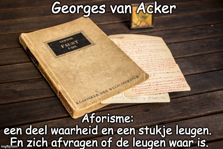 Aforisme: een deel waarheid en een stukje leugen. En zich afvragen of de leugen waar is.
